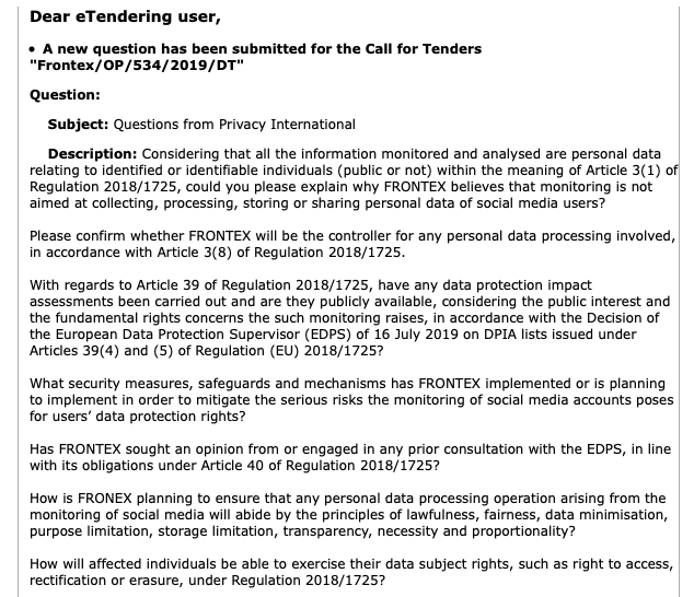These questions were based on a single legal instrument, Regulation 2018/1725, which is the equivalent of the GDPR for EU institutions and is thus meant to regulate how EU bodies like Frontex process personal data. Similar to other questions, the agency would have had to publish the answers on the tender site.