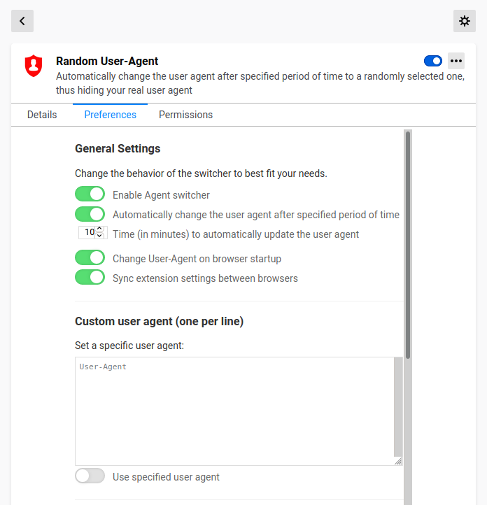 Cuando accedes a un sitio web, tu navegador envía una cadena llamada agente de usuario que recoge el nombre de tu navegador, el sistema operativo y otros metadatos técnicos de tu dispositivo. Desafortunadamente, los rastreadores suelen abusar de estos metadatos para crear una huella digital de tu sistema e identificarte con precisión en toda la web. Para limitar la capacidad de obtener tu huella digital, puedes instalar un conmutador de agente de usuario para cambiar periódicamente el agente de usuario de tu navegador y así dificultar que seas identificado con precisión.