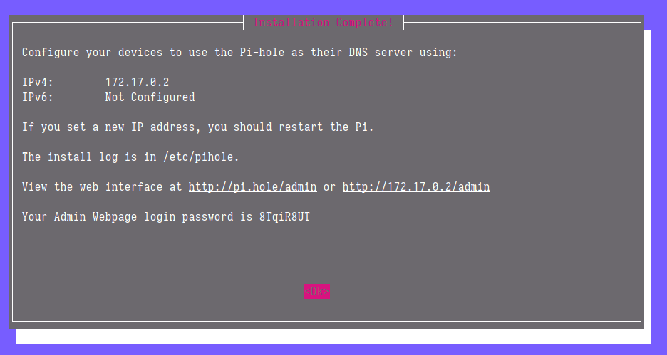 Cuando finalice la instalación, recibirás un mensaje resumiendo las direcciones IP de tu Pi-hole y una contraseña de administrador generada al azar (Fig. 9). Asegúrate de guardar esto en algún lugar (ya sea con una captura de pantalla o anotada en un papel), porque necesitarás la información más adelante.