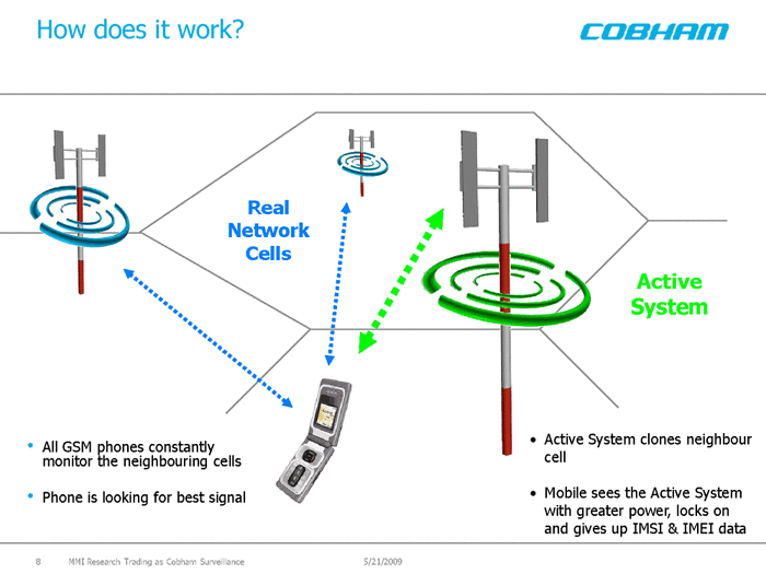 The system is described as active because of its focus in enticing the signal towards it, rather than passive monitoring which does not entice the signal but sits silently between the phone and the base station and does not replace the base station operation like an IMSI Catcher. The benefit of passive interception is that it is almost impossible to detect its operation, whereas an IMSI Catcher could be detected by a network operator because of the active enticing that it performs.