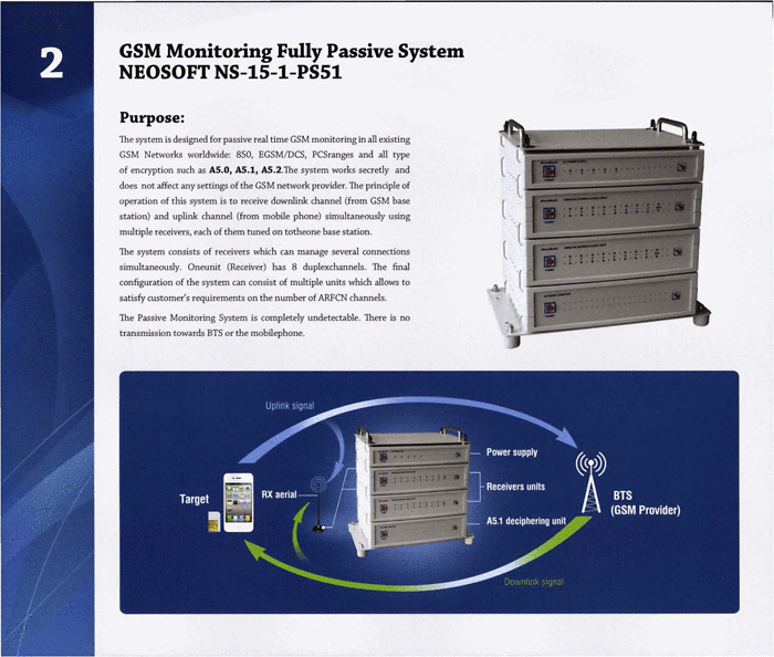 By simply tuning the equipment’s own receiver onto the correct frequencies that the uplink and downlink signals operate on phone monitoring technology can gain access to the information being transmitted over the network between the phone and the base station. The additional protections provided by GSM networks come in the form of ciphers A.5/1 A.5/2, which are designed to protect the privacy of the communication. Both of these ciphers had been reverse engineered by 1999, which means they were completely decipherable and that in practice all communications sent across the GSM network are prone to interception, deciphering and storage within a matter of seconds. A.5/2 is in fact prohibited from being used by mobile phones and has been since 2006 because of the concerns around its weakness. Many of the surveillance technologies sold in the market offer real time A.5/1 and A.5/2 deciphering features.