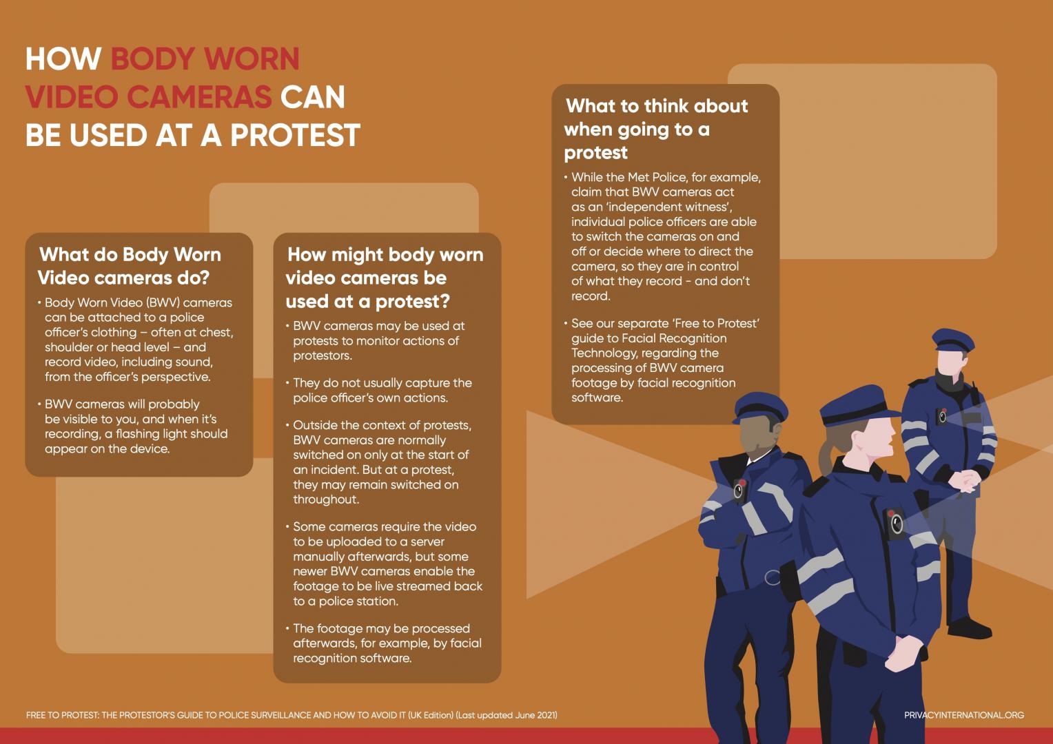- Outside the context of protests, BWV cameras are normally switched on only at the start of an incident. But at a protest, they may remain switched on throughout.
