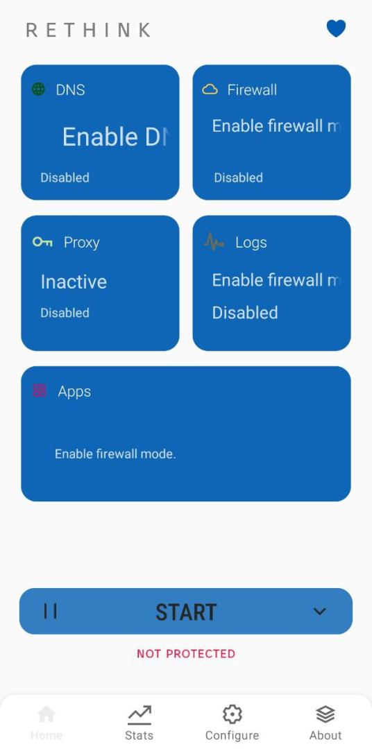 After Rethink is installed, you can open it by clicking on the icon or clicking on Open in the Play Store. By default, Rethink is configured to setup both DNS and Firewall. In order to block ads, it is enough to setup DNS. Unless you have a specific need for a firewall, you can leave it off, as this may unintentionally block regular traffic on your device, which may affect your browsing experience or Internet-connect apps. To change the default mode, click the arrow next to the Start button (Fig. 2) and then choose the first option, DNS (Fig. 3). To enable Rethink, click the Start button.