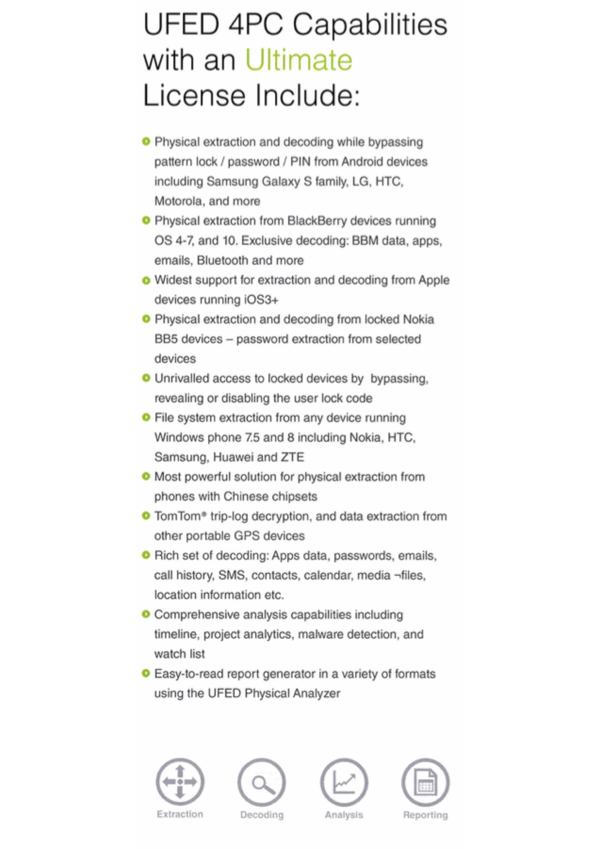 Revealed by Privacy International today, an excerpt from a recently acquired brochure shows Cellebrite advertising the “Widest support for extraction and decoding from Apple devices running iOS3+”. This capability comes at a price, Cellebrite has tiered license platforms. The company’s ‘Ultimate’ option includes many features that would be valuable a government or criminal enterprise, including the extraction of calendars, contacts, and even GPS analysis. Passwords and media files are also part of the extraction suite and a very wide range of hardware is supported by the equipment. The capabilities listed here give the user access to virtually all of the sensitive material contained on the target phone. It is highly unlikely that Cellebrite are the only party with these capabilities.