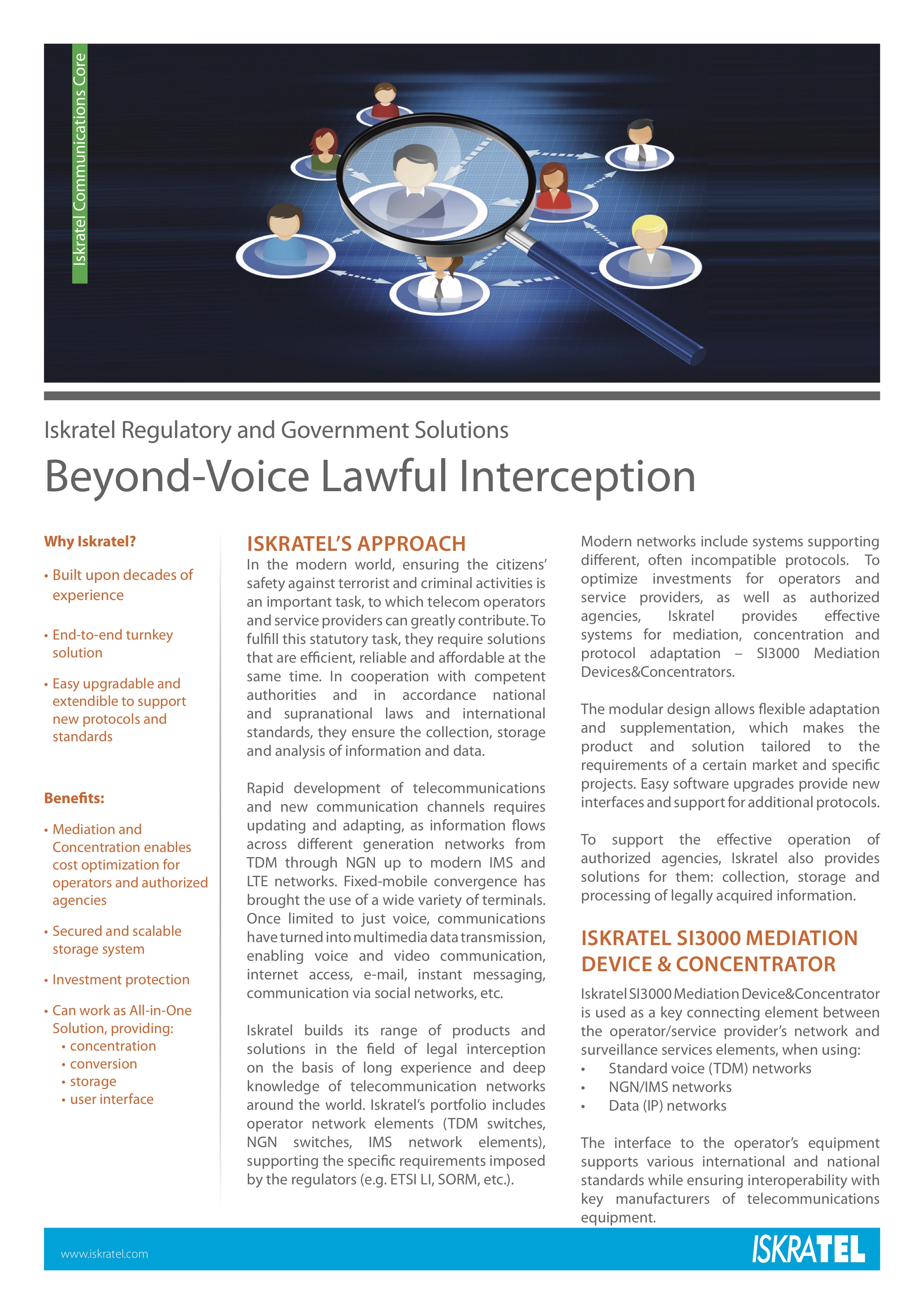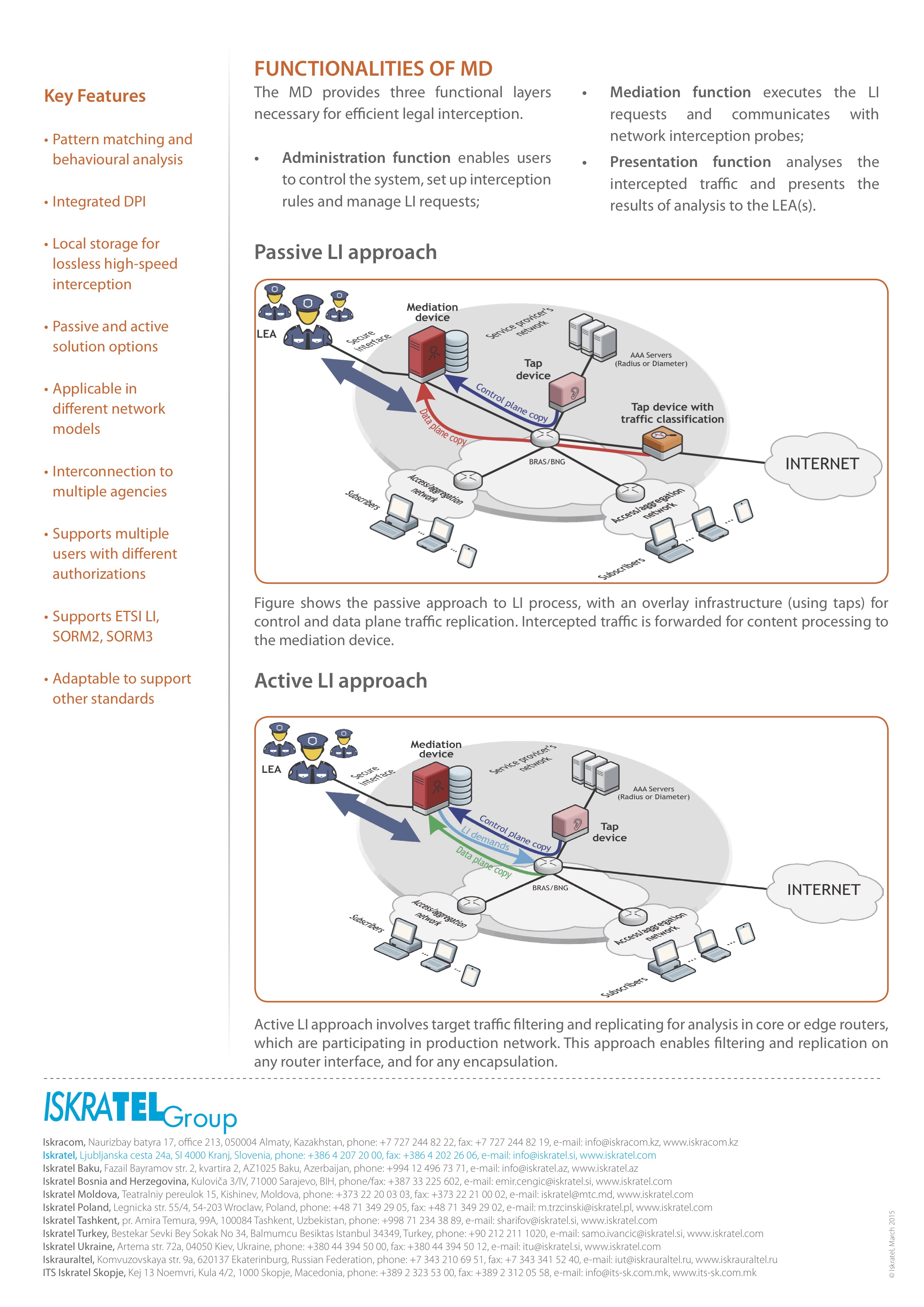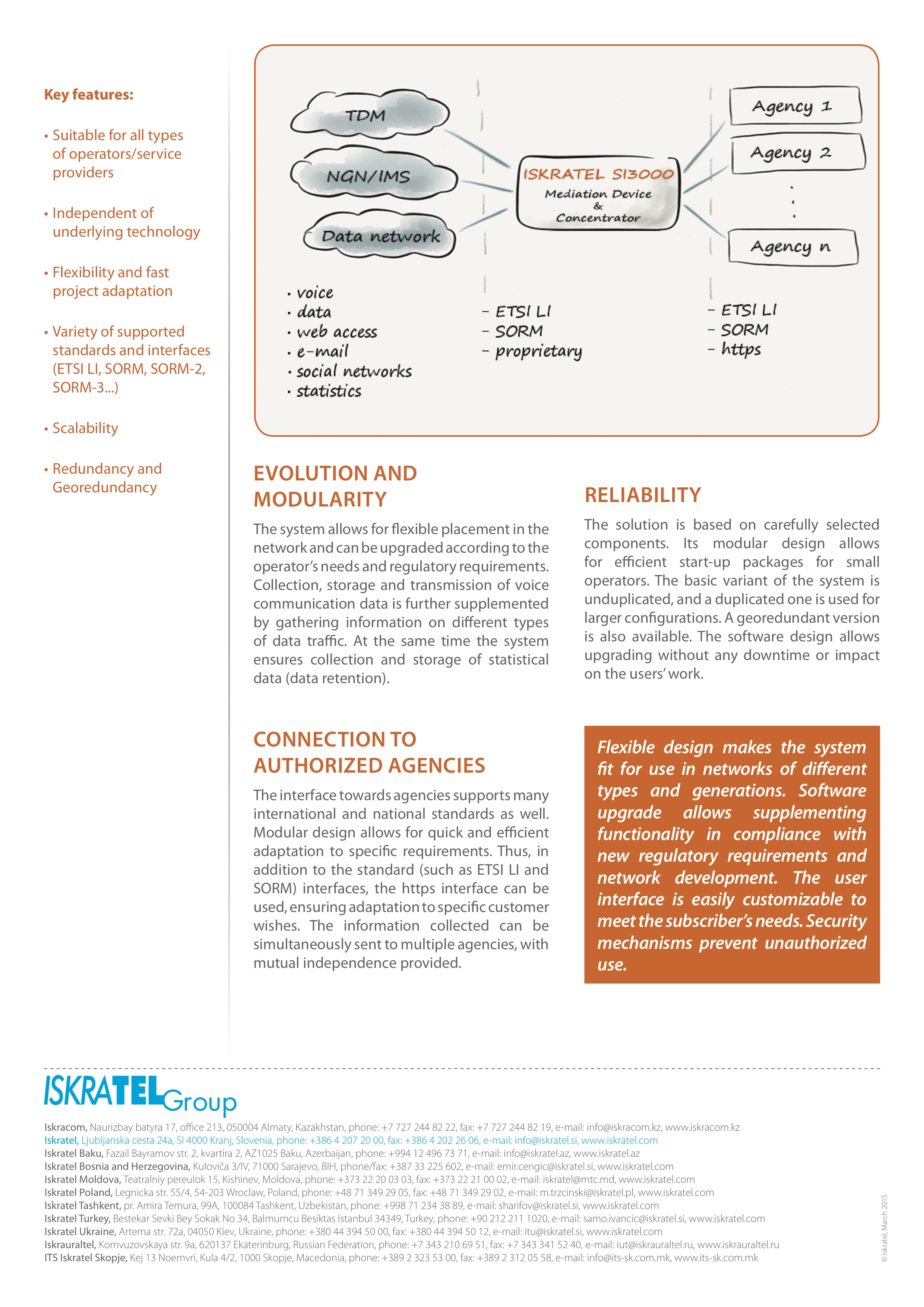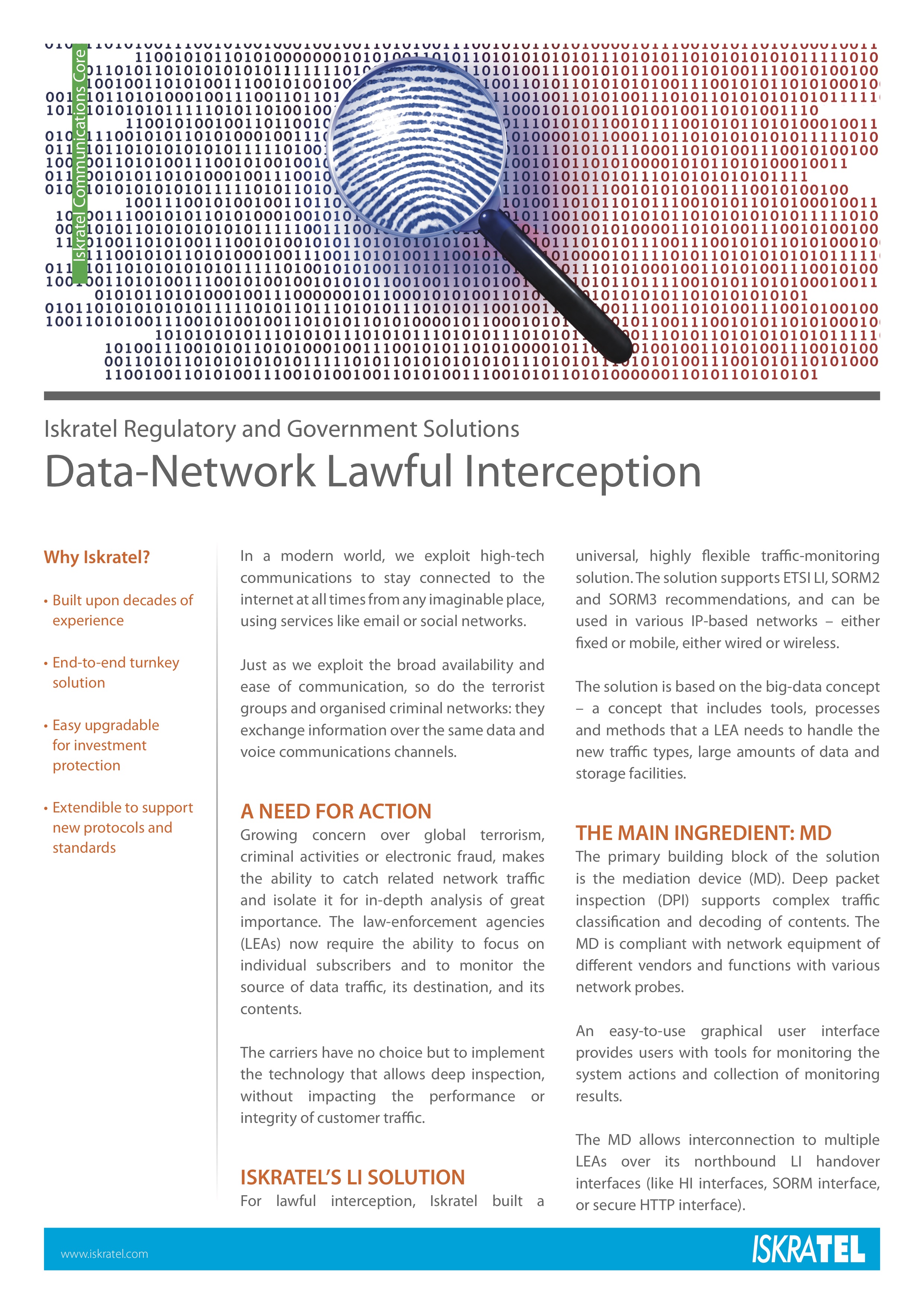 For lawful interception, Iskratel built a universal, highly flexible traffic-monitoring solution. The solution supports ETSI LI, SORM2 and SORM3 recommendations, and can be used in various IP-based networks – either fixed or mobile, either wired or wireless. The solution is based on the big-data concept – a concept that includes tools, processes and methods that a LEA needs to handle the new traffic types, large amounts of data and storage facilities.