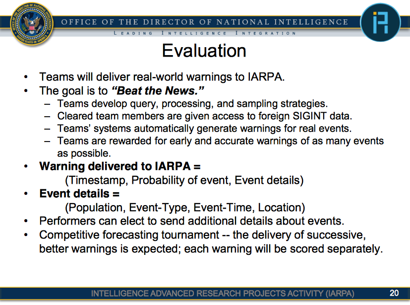 According to a slide for potential proposers produced by IARPA, research teams’ goal is to “beat the news” by automatically generating early and accurate warnings for as many real events as possible. To assist them, teams are provided with raw SIGINT data and facilities at the NSA’s Laboratory for Analytic Sciences at NC State University, North Carolina, from which they “may request access to additional SIGINT data and enrichment repositories”.
