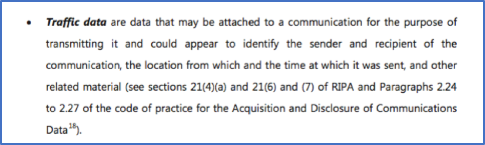 - “Traffic data” can be understood as including caller line identity, dialed number identity, cell location data and other details of the location or ‘address’ of a sender of recipient of a communication e.g. X phone number called Y phone number at 1:30 a.m. on 1.7.2016 for 5 minutes, while X was located at 123 High Street, London. With enough signal strength you could see whether the phone was at the front or back of the house, using multiple towers to triangulate location.