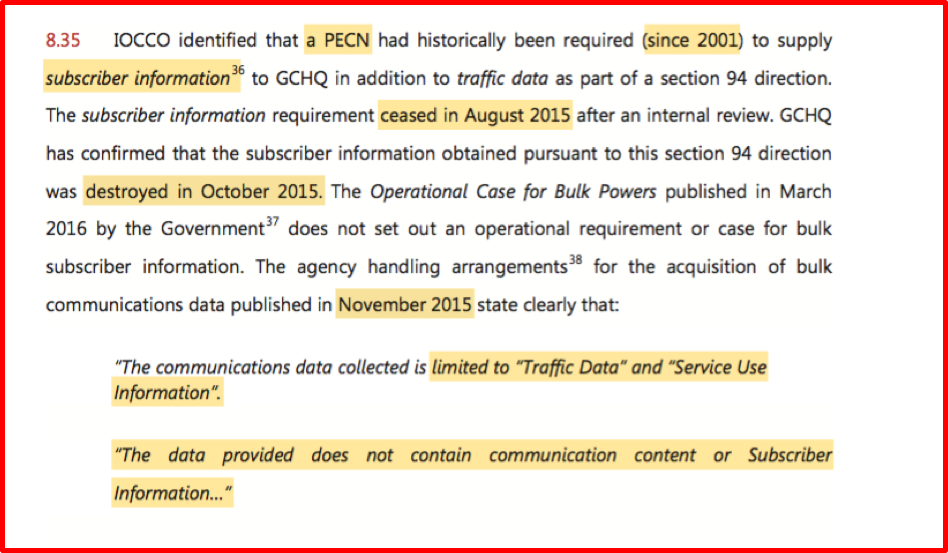 According to Sir Stanley, at least one PECN (Public Electronic Communications Networks) i.e. communications provider, provided subscriber information to GCHQ until August 2015. This data was destroyed in October 2015, one month before the publication of the ‘handling arrangements’, thus avoiding the need to disclose that subscriber information had been collected - as it was no longer current practice. It also avoided the need to make an operational case for ‘subscriber information’ within the Operational Case for Bulk Powers.