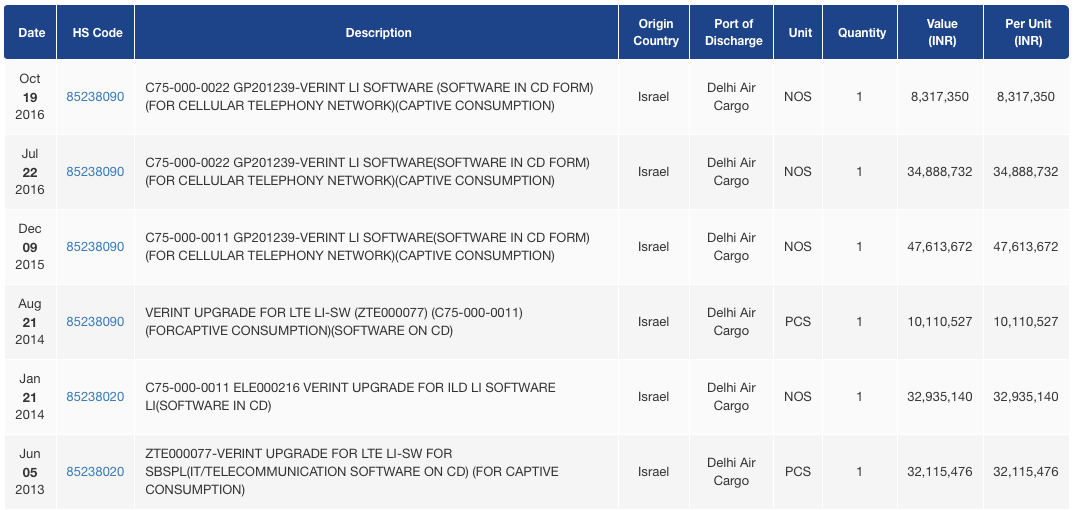 For example, some countries, for example India, publish shipping data about imports and exports. Searching for surveillance company names (available in the SII) in this data, or for industry terms commonly used by the surveillance industry, it’s possible to finds imports of surveillance equipment.
