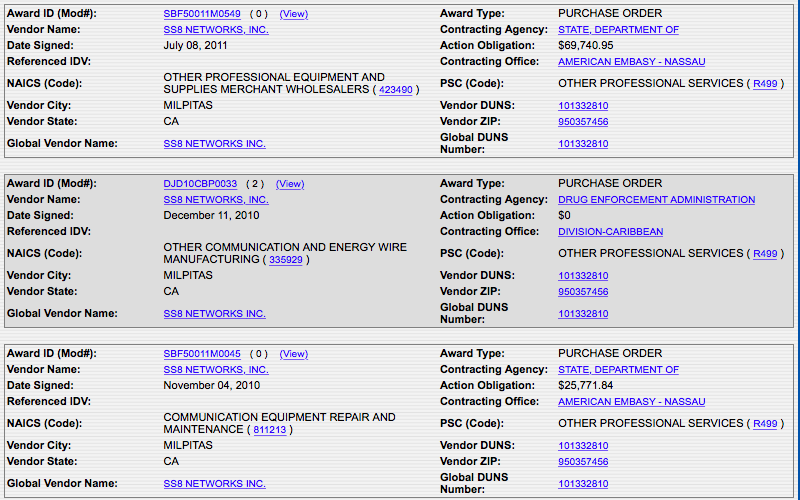 US federal procurement site, showing contracts between SS8, a surveillance company providing interception of telecommunications networks, and the US embassy in the Bahamas.