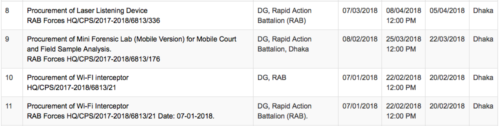 Individual countries also make publicly available procurement data, such as the Bangladeshi national procurement site, here showing various tender notices for various surveillance equipment.