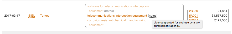 UK export licensing data showing the approval of a license to a law enforcement agency in Turkey