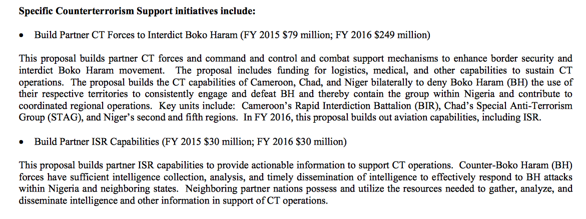 Other DoD information relating to policy and budgets can be found on its Open Government portal; budget documents describe general details of what some funds are used for. For example the Counterterrorism Partnership Fund is used to finance foreign agencies fighting Boko Haram, including Cameroon’s security forces, which have recently been accused by Amnesty of carrying out severe human rights abuses, including the use torture, as well as war crimes as part of their fight against the armed group.