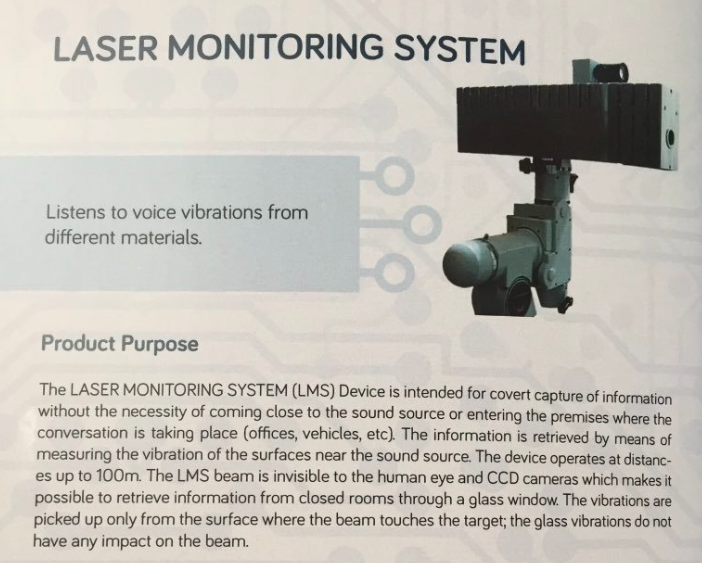 A laser microphone sold by a Lithuania-based surveillance company, Tigbis.