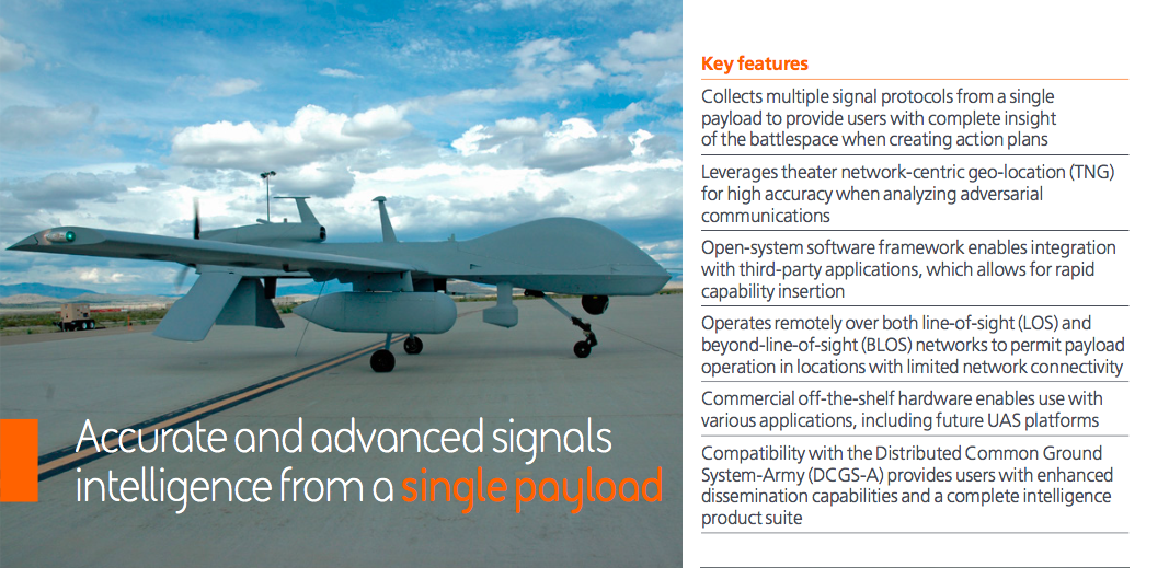 This category controls UAVs, or drones, which are designed to be able to fly out of sight of the operator and within certain performance levels. Drones can be fitted with advanced persistent aerial surveillance systems which can monitor, in detail and for hours at a time, movements on the ground, as well as electronic signals surveillance equipment which can be used to, for example, monitor mobile phone communications. Data generated by mobile phone use is used to target people for assassination by drones.