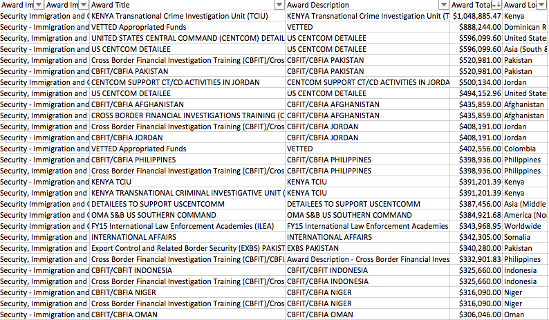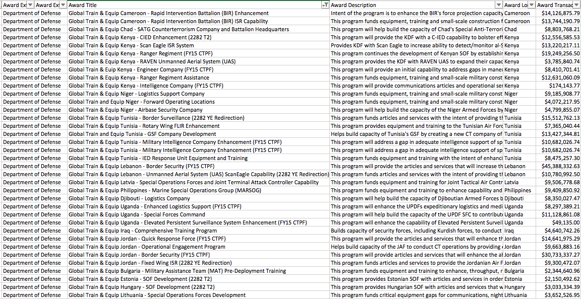 Some US agencies engaged in financing and training foreign security agencies also provide data to the US aid transparency portal, foreignassistance.gov. This includes the Departments of Defense, State, Interior, Justice, and Homeland Security. For example, it’s possible to get a breakdown of appropriated funds for specific agencies, projects, and countries – such as DoD Train & Equip programmes around the world, or the work which Immigration and Customs Enforcement (ICE), does with other security agencies around the world.