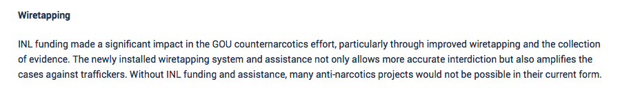 Specific US agencies and programmes sometimes provide their own publicly-available audit reports. For example, US Department of State Bureau of International Narcotics and Law Enforcement Affairs (INL) works with foreign security agencies with the mandate of reducing “the amount of crime and illegal drugs reaching U.S. shores.” The agency produces annual reports detailing US counter-narcotics strategy, which outlines trends and US facilitation of capabilities abroad, as well (up until 2009) as end-use monitoring reports, which for example shows INL funding for telecommunications wiretapping in Uruguay.