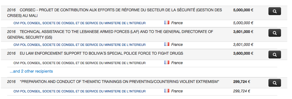 The European External Action Service, the EU’s foreign policy body, manages various funds; the Emergency Trust Fund for Africa for example, with an allocated budget of €3.3 billion, supports 26 countries to improve resilience to food insecurity, support job creation, and address human rights abuses. A key focus of the fund is migration, for example committing €28 million to develop Senegal’s nationwide biometric system (implemented by a private security company formerly part of the French Ministry of Interior). The projects are available under the various thematic and regional webpages.