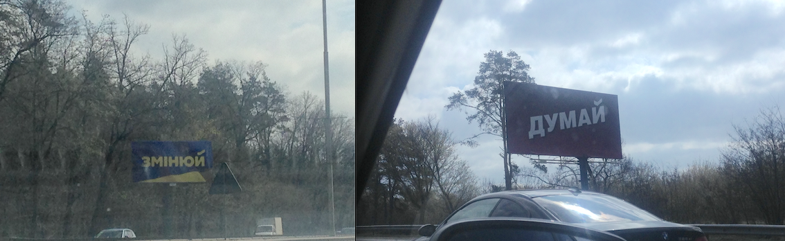 Photo: Dotted around the country’s capital city Kyiv, are billboards from the two battling front-runners, the incumbent Petro Poroshenko and frontrunner, comedian/actor Volodymyr Zelensky. “Думай” – “think” say the Poroshenko billboards, with Zelensky’s billboards responding “Змінюй – “change it”.