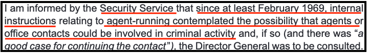 During the course of these proceedings, it became clear that the present MI5 policy on agent participating in criminality has been in place at least since the early 1990s and there are indicators that earlier versions existed since at least the 1960s. According to the Pat Finucane Review, since 1969 there had been internal instructions that “contemplated the possibility that agents . . . could be involved in criminal activity.”
