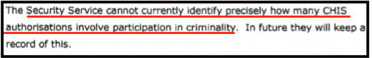 The lack of effective oversight is demonstrated by the concerns expressed by the Investigatory Services Commissioner about the operation and application of MI5’s guidelines. For example, in 2014, according to a report by the Investigatory Services Commissioner, MI5 was unable to “identify precisely how many [“Covert Human Intelligence Sources”] authorisations involve participation in criminality.”