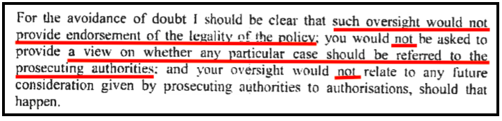 Before 2012, there was no oversight whatsoever of these guidelines or how MI5 applied them. After 2012, any oversight has been minimal and ineffective. The Investigatory Powers Commissioner (under Regulation of Investigatory Powers Act 2000) was asked by then Prime Minister David Cameron not to comment on “the legality of the policy,” whether any particular case should be referred to the prosecuting authorities”.