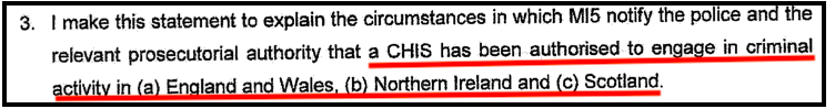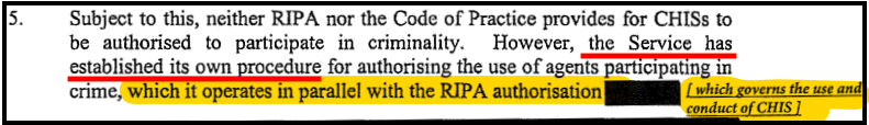The procedure for MI5 to authorise “agents” or CHIS to commit crimes was created by MI5 itself. The “Security Service Guidelines on the use of Agents who Participate in Criminality” concedes that the covert human intelligence sources code of practice does not immunise agents from prosecution; instead, it amounts to an attempt by MI5 itself to establish “its own procedure for authorising the use of agents participating in crime”.