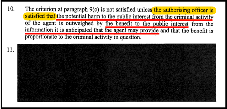 Through the limited information that the redacted disclosures of the “Guidelines on the use of Agents who participate in Criminality (Official Guidance)”, we discovered that the Guidelines provide that “No member of the Service shall encourage, counsel or procure the commission by an agent of a criminal offence, save and to the extent that the offence is covered by an authorisation issued under these Guidelines.”