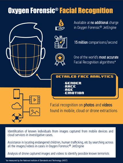 From July 2019, Oxygen Forensics JetEngine module, which is built into the Oxygen Forensic Detective, provides the ability to categorise human faces. Not only do Oxygen provide the categorisation and matching of faces within extracted data, facial analytics allows them to categorise gender, race and emotion recognition.