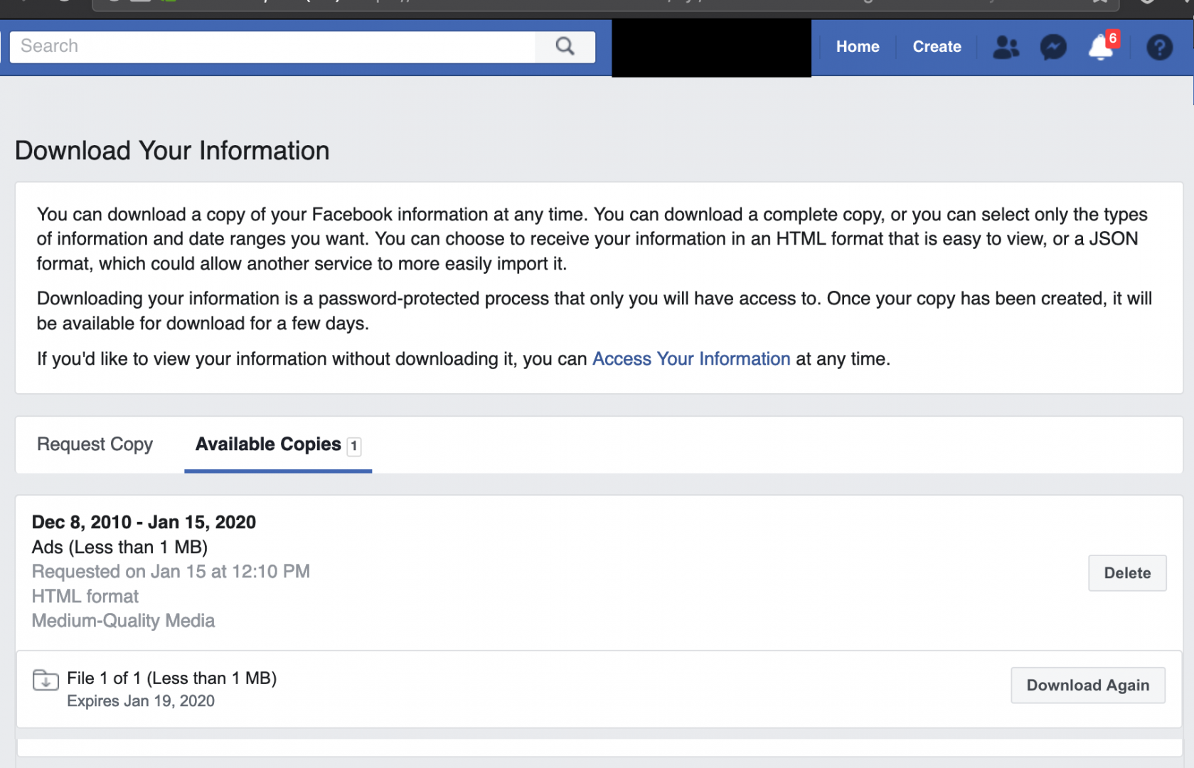 Ads section on Facebook “Download Your Information” page.
