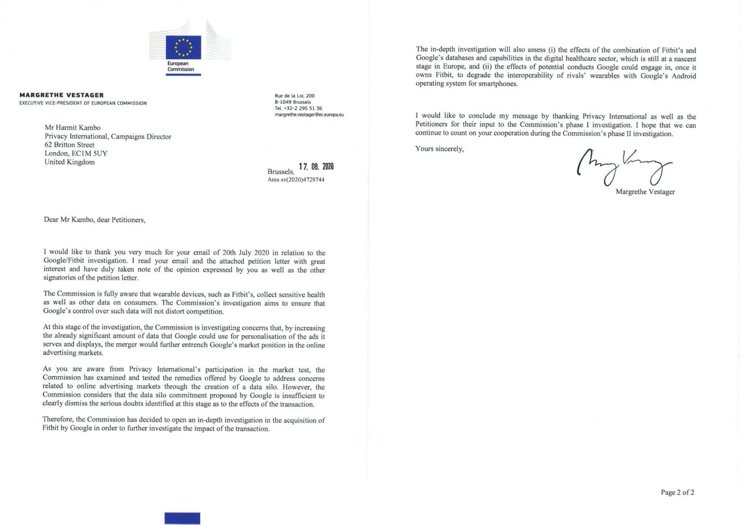 During summer 2020, over 2,500 people signed PI's public petition opposing the proposed Google/Fitbit merger. We sent the petition to the European Commission, who are yet to decide if the merger can proceed. The Commission responded by thanking petitioners for their concerns and cooperation, just as they opened a detailed phase 2 investigation into the merger.