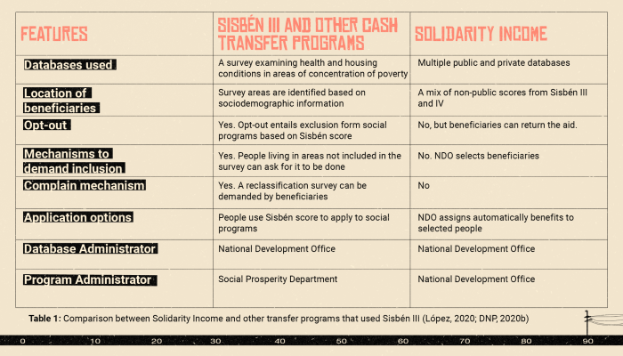 The Solidarity Income changed the relationship between the data used to assign a benefit and the participation of people in the system. Amid the crisis, the response was an experiment that involved using as much data as possible to “find” people who “needed” but were not receiving traditional social programs. The program built a new Master Information Database, in which the National Development Office (NDO) mixed all kinds of administrative records. They used data collected for diverse purposes and managed by private and public actors. These databases have different levels of quality, and some were unknown to many Colombians. In other words, it is no longer a matter of “finding” vulnerable people in the areas affected by poverty but of “taking advantage” of the personal data that we are leaving in our interaction with different institutions.