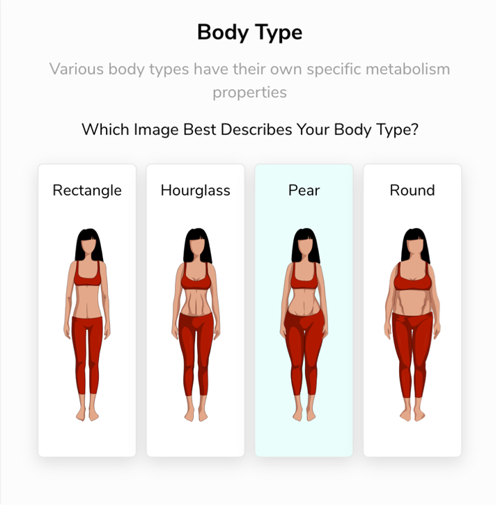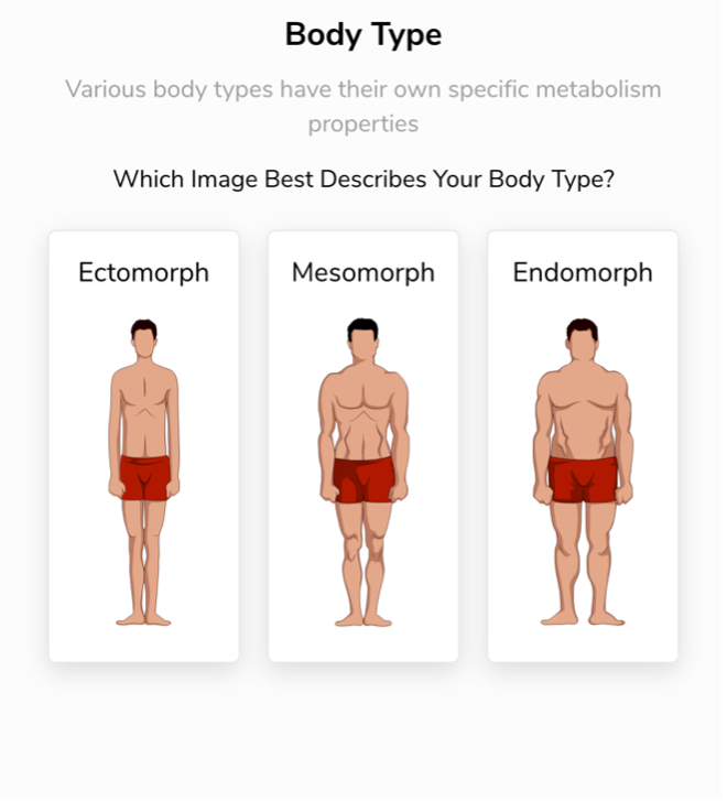 The test requires you to define your body type (‘rectangle,’ ‘hourglass,’ ‘pear’ and ‘round’ for women; ‘ectomorph,’ ‘mesomorph,’ and ‘endomorph’ for men) before going on to lifestyle questions: what does your typical day looks like (at the office, taking long walks, doing physical work…), when were you last at your ‘ideal weight,’ what your ‘bad habits’ are (not getting enough sleep, eating late at night, eating too much sweet or salt, soft drinks…), how much do you exercise, what are your energy levels like, how much do you sleep, how much water do you drink, what kind of food you enjoy eating…