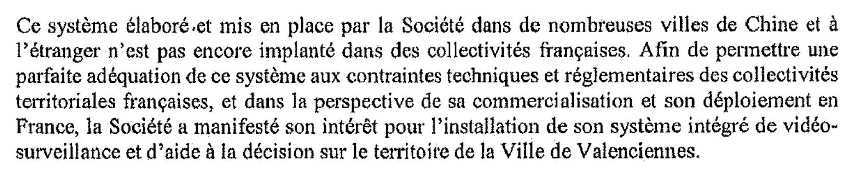 “This elaborated system put in place by the company [Huawei] in many cities in China and abroad is not yet established in French towns. In order to allow a perfect adjustment of this system to the technical and administrative constraints of the French local authorities and with the perspective of its sale and deployment in France, the company expressed its interest in installing its CCTV cameras and decision-making assistance integrated systems in the city of Valenciennes.”