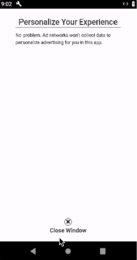 We indeed got started on the app without having to create an account and without having to complete any onboarding questionnaire. Then, we were presented with a consent pop-up for the processing of user data for networks like Google, InMobi and AerServ. We clicked 'No, thank you' (Figure 4.1), which confirmed that 'Ad networks won't collect data to personalise advertising for you in this app' (Figure 4.2).