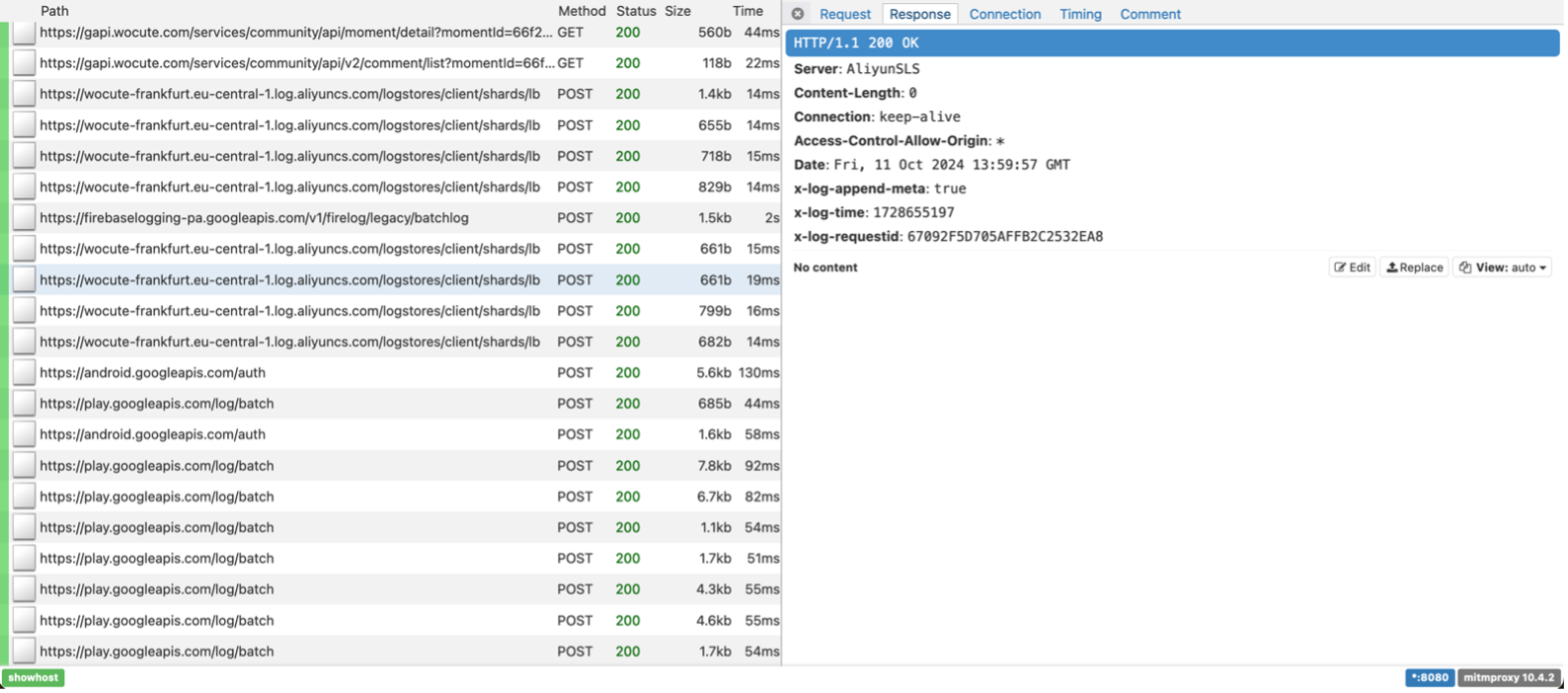 As for cloud servers, we noticed that certain API requests (not all) occurred over the 'AliyunSLS' server, which is a cloud service run by China-based Alibaba: