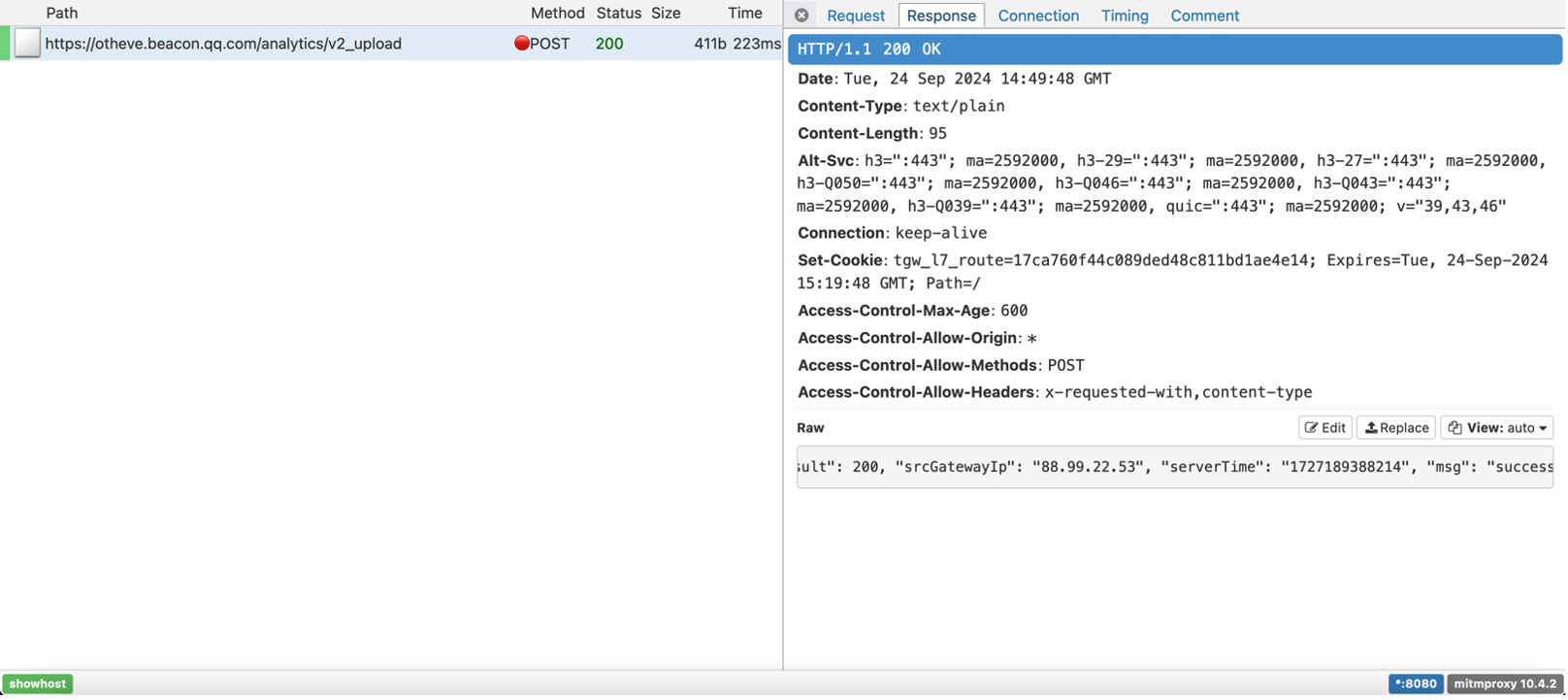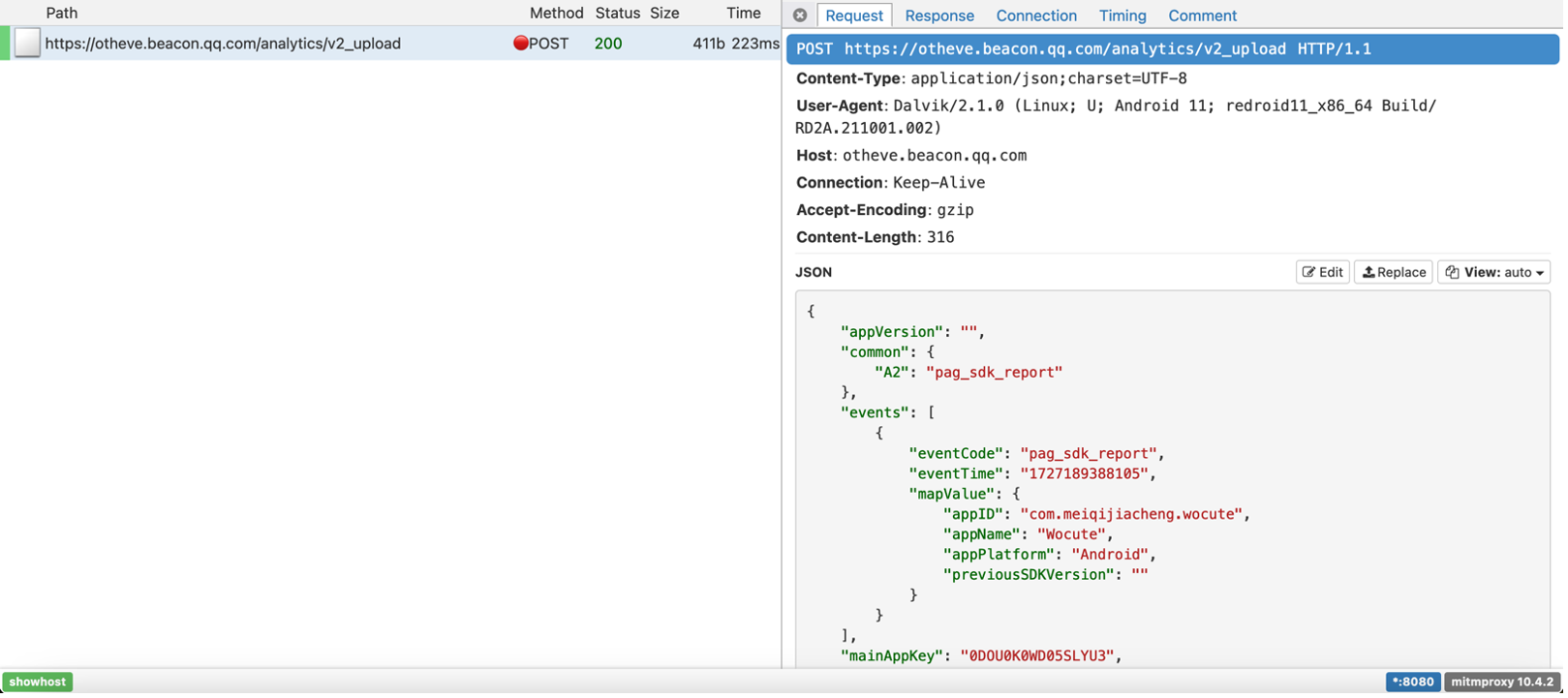On the matter of third parties, we noticed third-party URL paths pointing to Beacon QQ, which is an analytics tool that can be packaged with China's Tencent platform to update the server with a user's data, likely comparable to Google's Firebase: