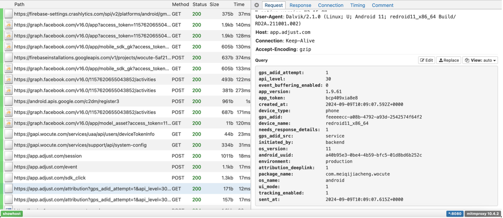 The web traffic also contained URL paths for third party Adjust (Figure 6.6), which is a Berlin-based analytics service integrated with apps for the purposes of measuring and scaling an app's marketing activity. Throughout our onboarding and use of the app, Adjust intermittently requested device-related data and responded with an ad ID: