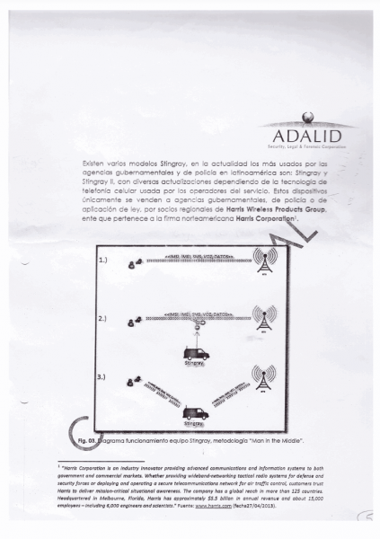 Privacy International obtained a confidential legal document (see annex) from April 2013 pertaining to the case between Argentina and Colombia. The document is a technical concept written by the Colombian forensic company Adalid. It was ordered by a government to explain to another government the use of a model of IMSI catcher called “Stingray” from the company Harris Corporation. The document was shared with us by a source close to the case and we believe the document to have been ordered by Colombia for submission to the Court in the case brought by Argentina.