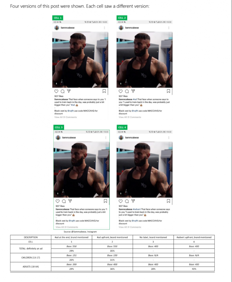 Screenshot from 2019 study commissioned by the Advertising Standards Authority which looked at what type of advertising disclaimer most resonated with users of social media.