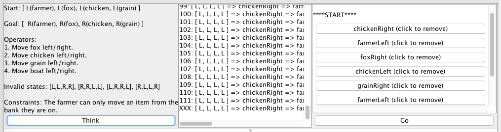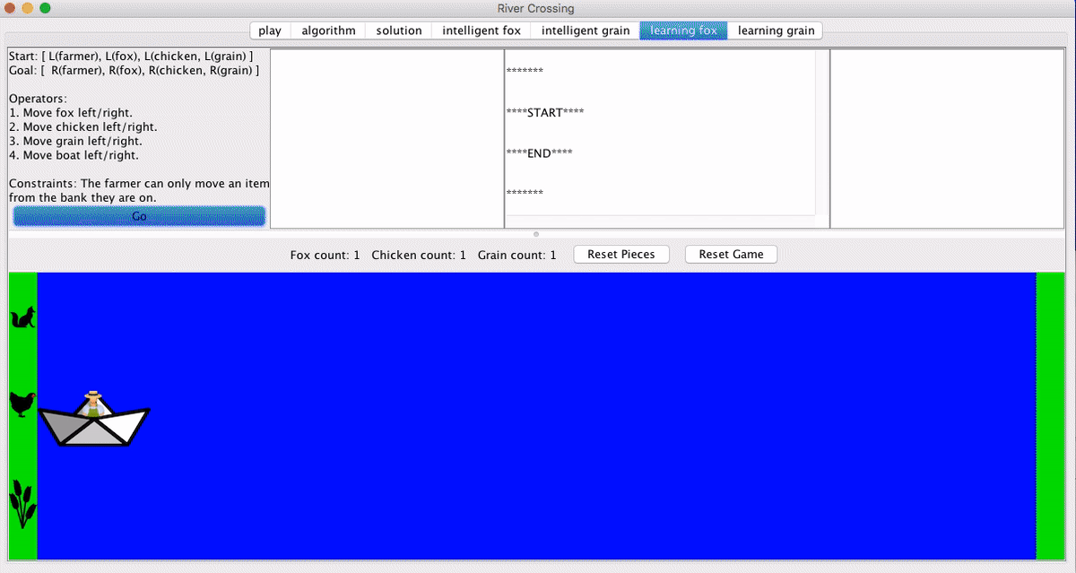 Bringing the fox first, in our example, means sacrificing the grain. And what is the farmer supposed to learn from this? On the one hand, he could learn that only this configuration is bad. This might be a naive inference — like learning how a child burns himself on a stove, it would be silly to think that only that stove will burn you. At the other extreme, the farmer might see that the fox can never be on the right bank. Not only is this too general an inference, it will also prevent the farmer from completing his task because the goal is to get the fox to the right hand side. The learned invalid states are in the box on the right, above the animation.