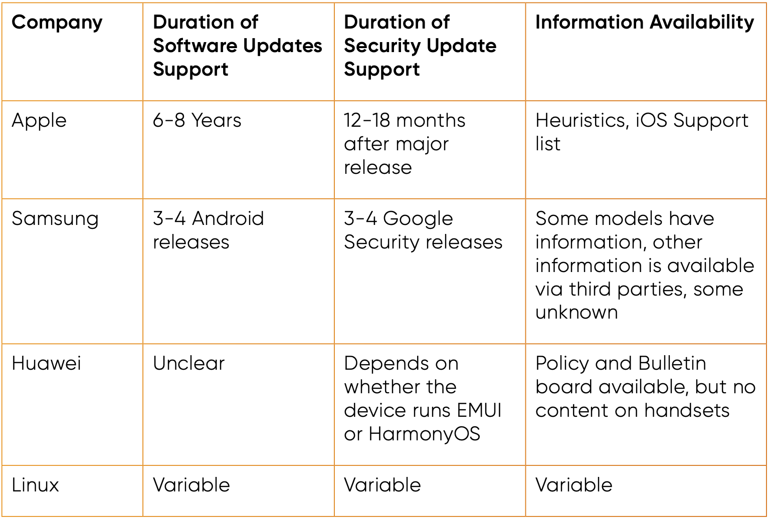 Our research found that the current landscape of smartphone software updates is extremely complex with varying approaches adopted across manufactures. While 54% of consumers expected their smartphones should be protected for longer than 2 years (25% 2-5 years; 15% 5-10 years and 14% beyond 10 years), company practices conveyed that software support can range from 3 years or less to a minimum of 6 for certain devices. Only one manufacturer provides both smartphone hardware and software, which lends to a degree of transparency regarding the expected support duration. In contrast, where companies provide the hardware device only, all of which use Google’s Android OS software on their smartphones, the research was unable to yield a clear or precise duration of how long devices are expected to receive software and security updates.