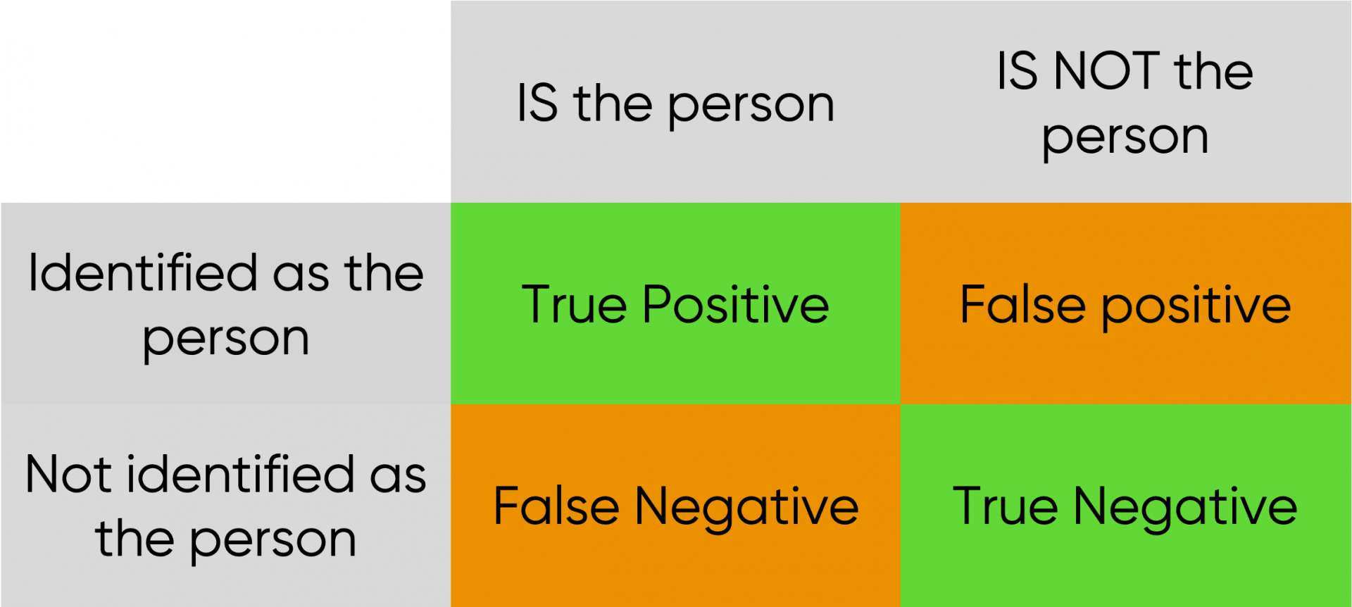 A true positive occurs when a person is successfully identified, while a true negative occurs when the system successfully identifies someone else's biometric as not a match for the target person being identified. A false positive occurs when the system wrongfully identifies the wrong individual as a match for the target person being identified, potentially leading to unauthorised access from other users, and finally a false negative represents the case where an individual is unable to be identified when it's in fact them identification, potentially leading to exclusion.