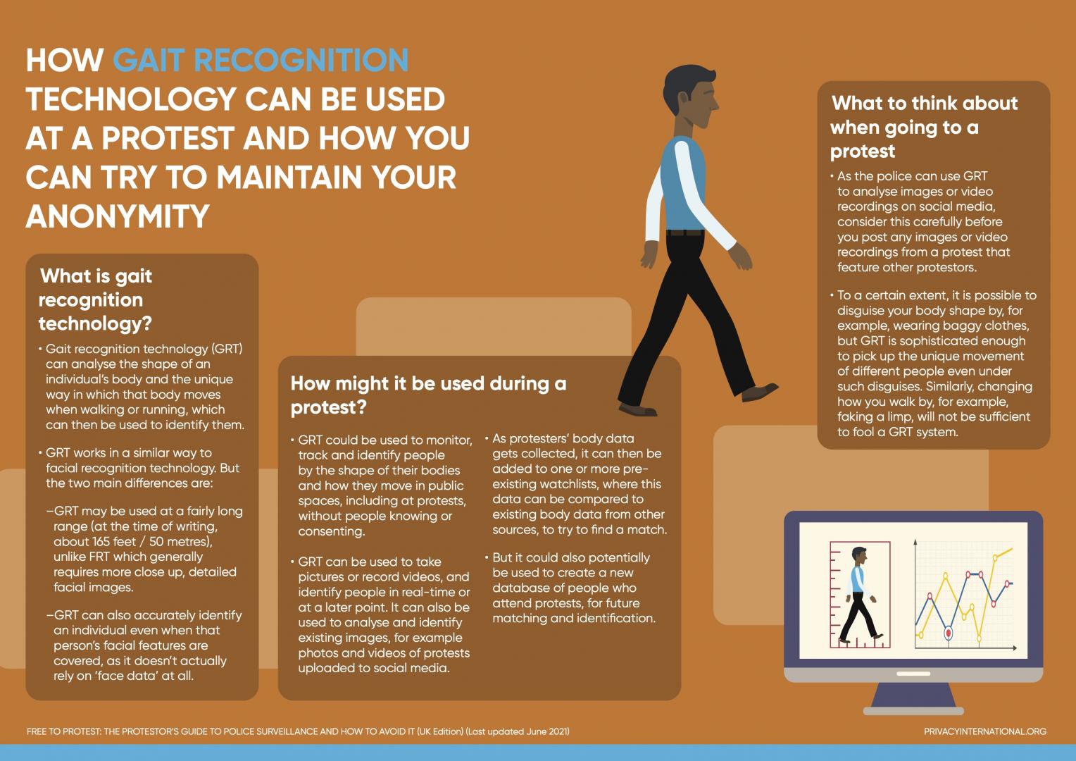 - GRT could be used to monitor, track and identify people by the shape of their bodies and how they move in public spaces, including at protests, without people knowing or consenting.