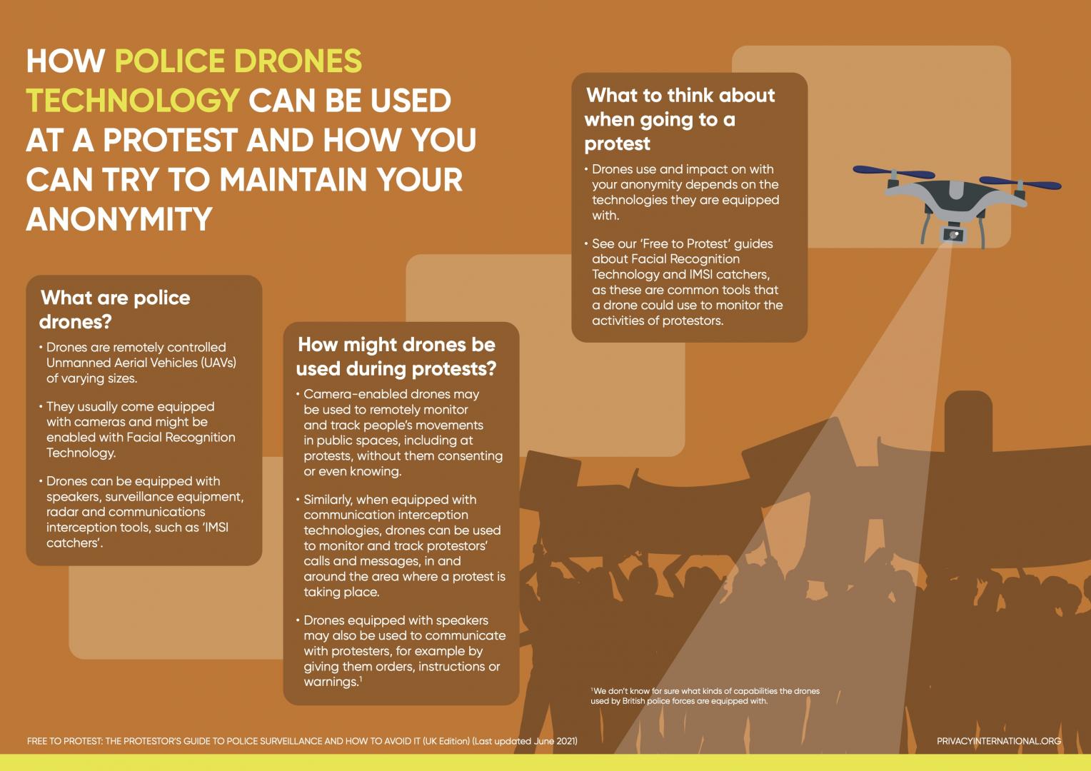 - Drones may be used to track people’s movements during a protest, or monitor protesters’ calls and messages.