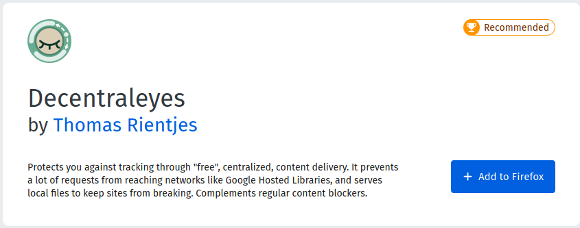 Like any other add-on, install Decentraleyes by visiting the [Mozilla Firefox Add-ons page][1] and clicking Add to Firefox (Fig. 1) and then clicking on Add when prompted (Fig. 2).