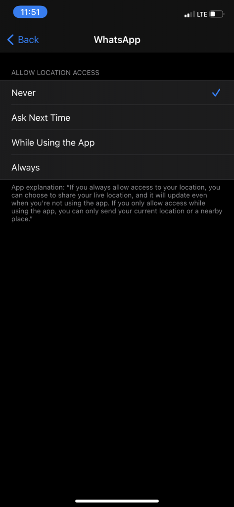 It is good practice to turn off location-sharing – particularly if you don’t intend to share location with contacts – as it’s not always clear if and when and what granularity of location data is shared with an app.
