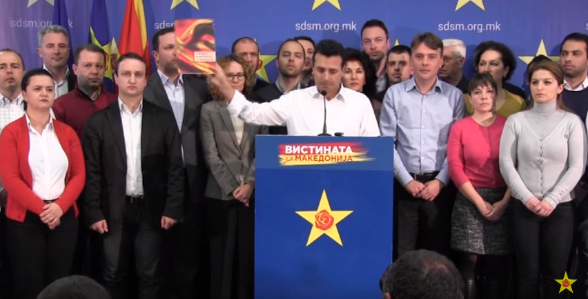Opposition leader Zoran Zaev announcing the wiretaps and holding copies of the recordings. February 2015. Youtube