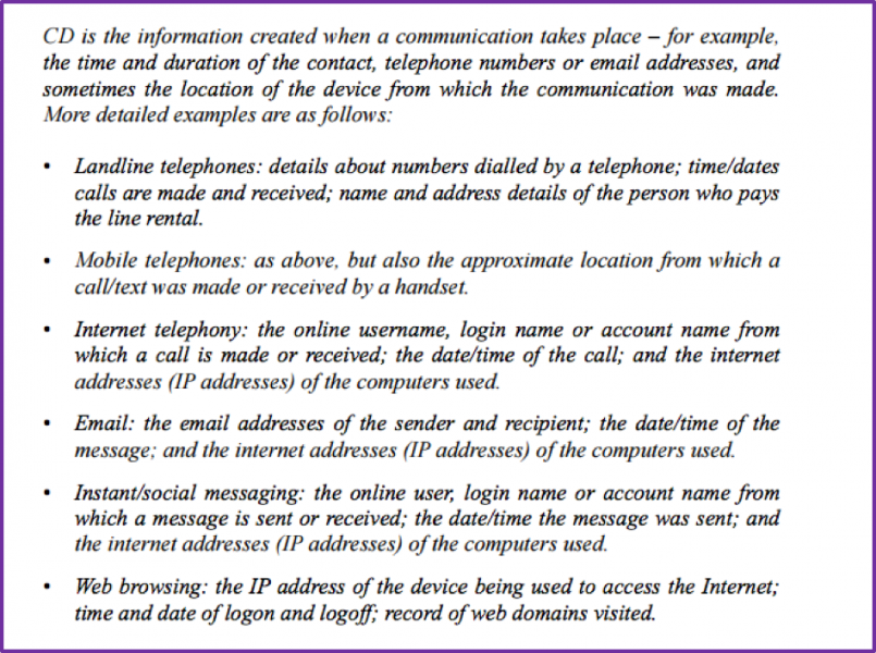 The Intelligence and Security Committee in their 2015 report set out examples of communications data: