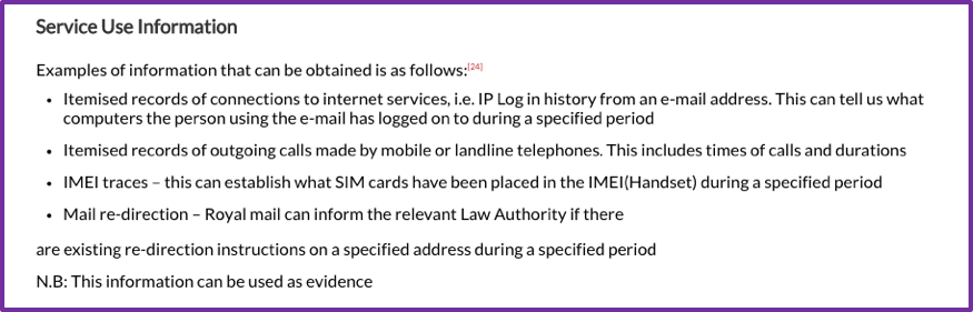 - “Service data” / “Service Use Information” is data relating to the use made by any person of a communication service and may be the kind of information that habitually used to appear on an itemized billing document supplied to customers (s.21(4)(b) of RIPA and paragraphs 2.28 and 2.29 of the code of practice for the Acquisition and Disclosure of Communications Data.) It includes billing and other types of service use information such as call waiting and barring, redirection services and records of postal items;